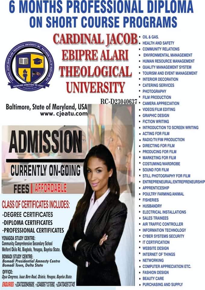The Cardinal Jacob Ebipre Alari Theological University offers admission into various specialized disciplines at Certificate, Diploma, Undergraduate, and Post Graduate levels. The university uses the admission criteria of the United States where it is incorporated. The rich curriculum of the university ensures that our graduates can stand out among the best in the world with the relevant knowledge, experience, and guidance. The Admissions Unit is available to offer services to prospective students to navigate their enrollment.
