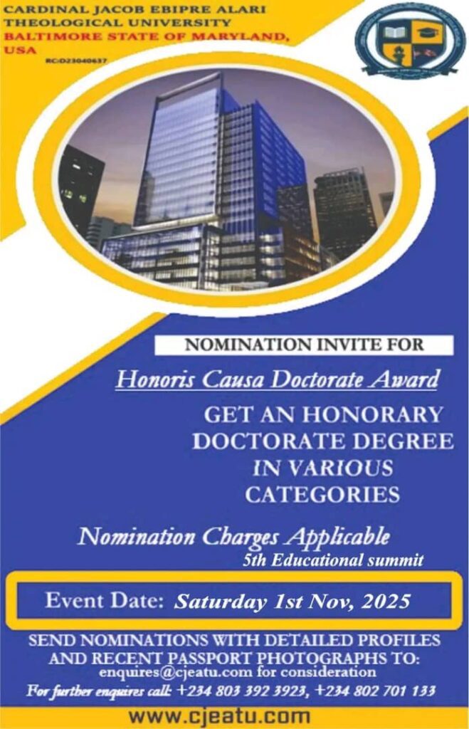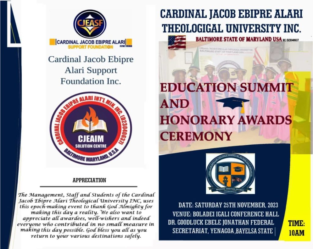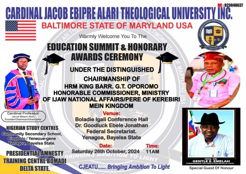 All is now set for the third Educational Summit and Honourary Awards Ceremony of Cardinal Jacob Ebipre Alari Theological University, Baltimore State of Maryland, USA to be held in Yenagoa.
