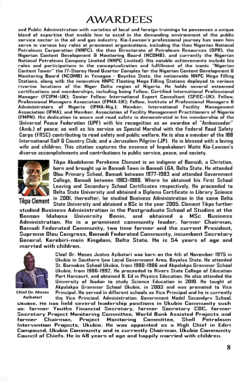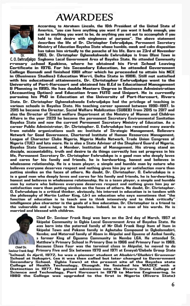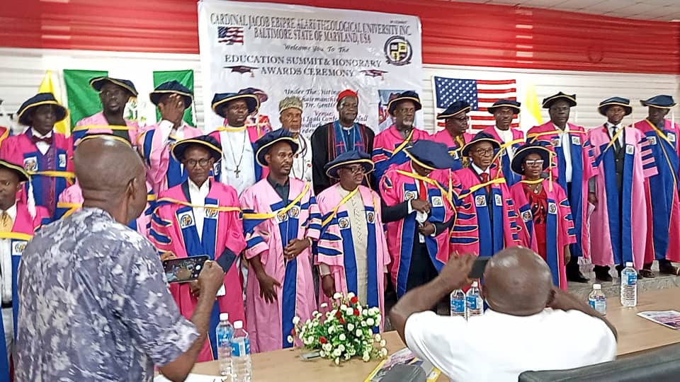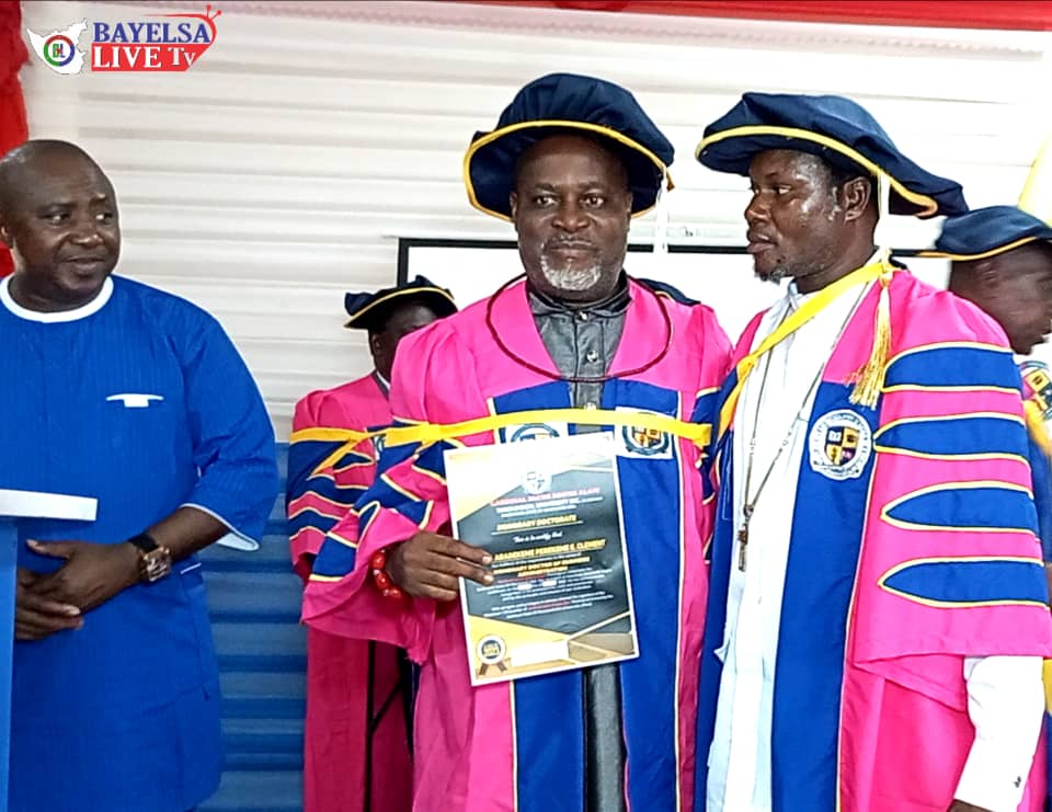 On behalf of the Bayelsa State chapter of the Ignatius Ajuru University of Education Alumni, the State Exco express their gratitude to the institute ‘Cardinal Jacob Ebipre Alari Theological University Baltimore State of Maryland USA. For the conferment of the ward of Honorary Doctorate Degree to the Chairman of Ignatius Ajuru University of Education Alumni, Bayelsa State Chapter, Dr. KARINABO NATHS BENIBO and Elder Dr. LEWIS OMBU SAWARE. The awards are absolutely on merit and not political or financially motivated rather, it’s on moral exhibition.