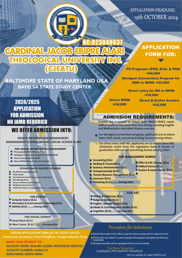 The Cardinal Jacob Ebipre Alari Theological University offers admission into various specialized disciplines at Certificate, Diploma, Undergraduate, and Post Graduate levels. The university uses the admission criteria of the United States where it is incorporated. The rich curriculum of the university ensures that our graduates can stand out among the best in the world with the relevant knowledge, experience, and guidance. The Admissions Unit is available to offer services to prospective students to navigate their enrollment.