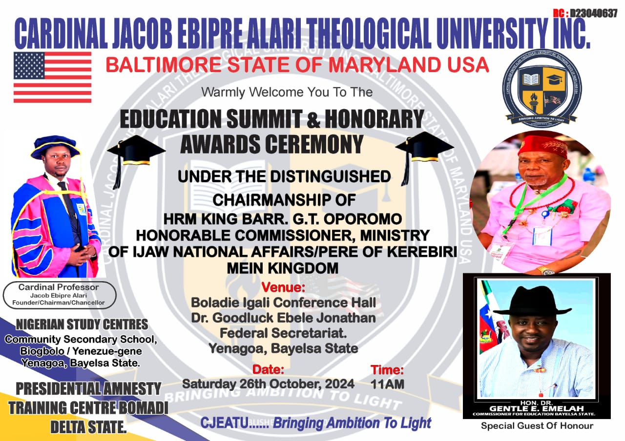 All is now set for the 5th Educational Summit and Honourary Awards Ceremony/ educational summit and symposium of the Cardinal Jacob Ebipre Alari Theological University, Baltimore State of Maryland, USA under the distinguished Chairmanship of King Barr. Godspower Tams Oporomo,Pere of Kerebiri Mein Kingdom and Commissioner for Ijaw National Affairs, Bayelsa State, Dr Gentle Emelah, Honourable Commissioner for Education, Bayelsa State as Special Guest of Honour.