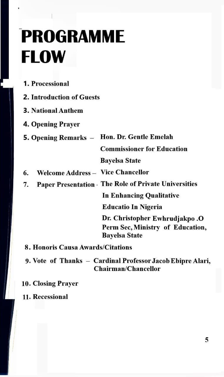 Unveiling the programme of event in Yenagoa during a world press conference, Cardinal Prof Alari Ebipre Jacob, the founder and Chancellor of the University states that the programme will be held on Saturday 1st November,2025 by 11:am prompt at the Dr Goodluck Jonathan’s Federal Secretariat-Boladei Igali Hall, Ox bow lake Road, Yenagoa.